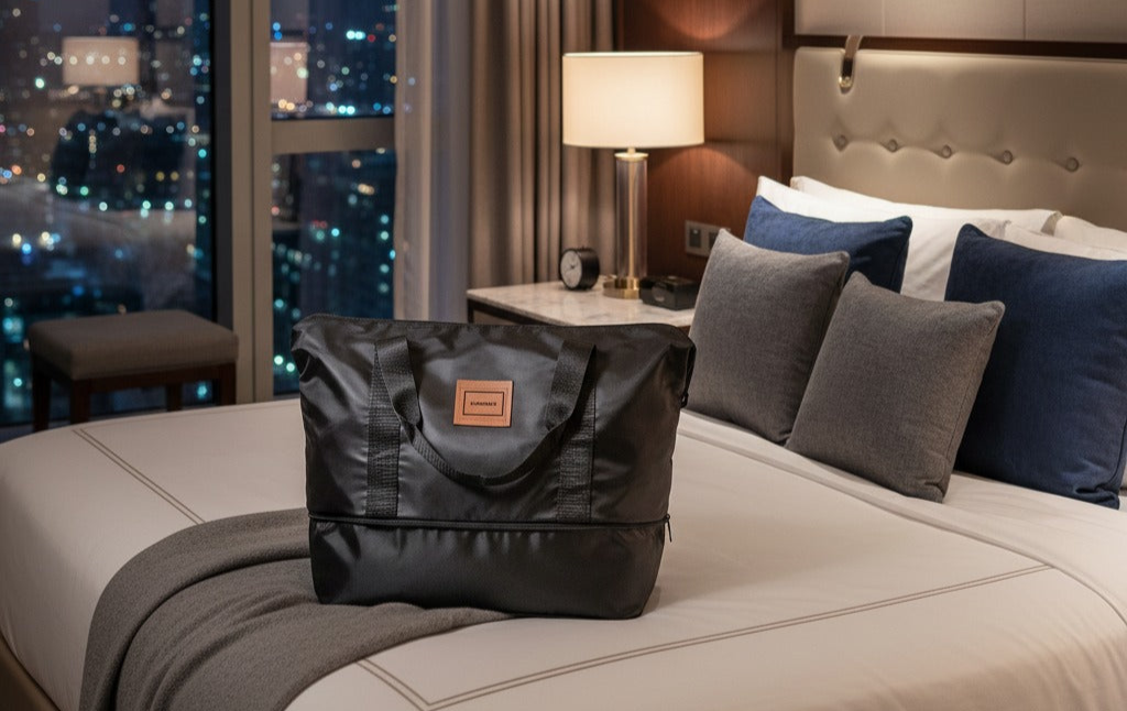 Our bag is carry-on size, so just throw everything in and carry it on the plane.No checked bag fees, no waiting at baggage claim.